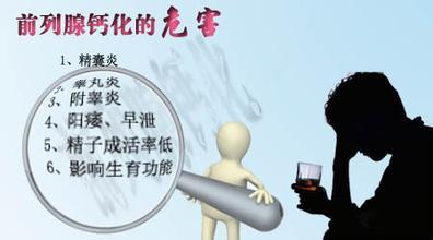 1. 前列腺钙化灶一般是炎症遗留的瘢痕,如果不及时的治疗还会诱发精囊炎、睾丸炎、附睾炎等,还会出现阳痿早泄等性功能异常,不仅会影响性生活质量还会影响到生育功能。 由于前列腺结构的特殊性,前列腺钙化灶上易滋生细菌,对于青壮年患者来说,又是前列腺炎反复发作的一个因素,不容忽视。