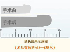 我们曾追踪85例患者,追踪期3个月到4年之间,关于阴茎长度,其中83例增长3.1~5.2厘米(平均 4.1厘米),仅2例情况较特殊无法延长过多,仅延长1.1cm。
