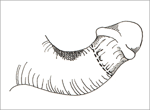 2、包皮系带过短牵拉龟头引起阴茎下弯
